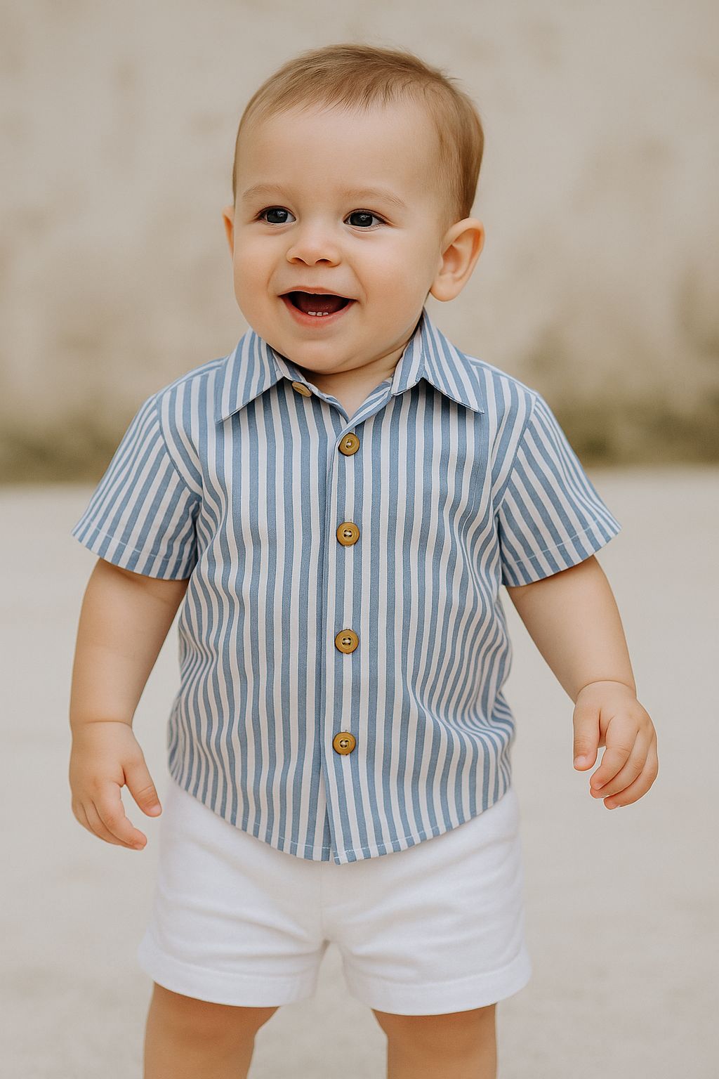Camisa LUAN – confeccionada em TECIDO 100% algodão encorpado, com listras brancas e azuis. Possui bolso frontal do lado esquerdo e botões em madeira, que agregam charme e um toque rústico à peça.