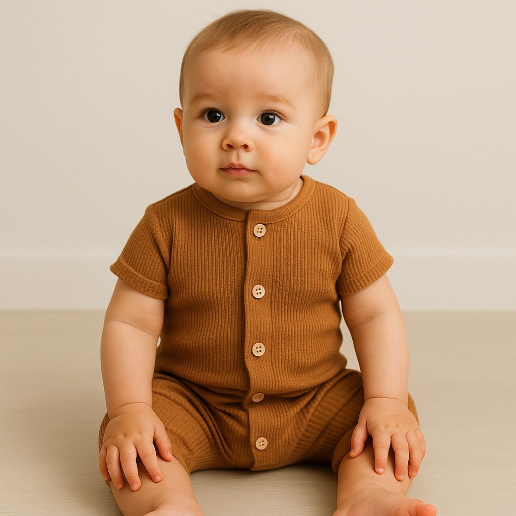 Macacão Theo, confeccionado em malha texturizada (100% algodão) caramelo, com fechamento em botões em madeira na frente.