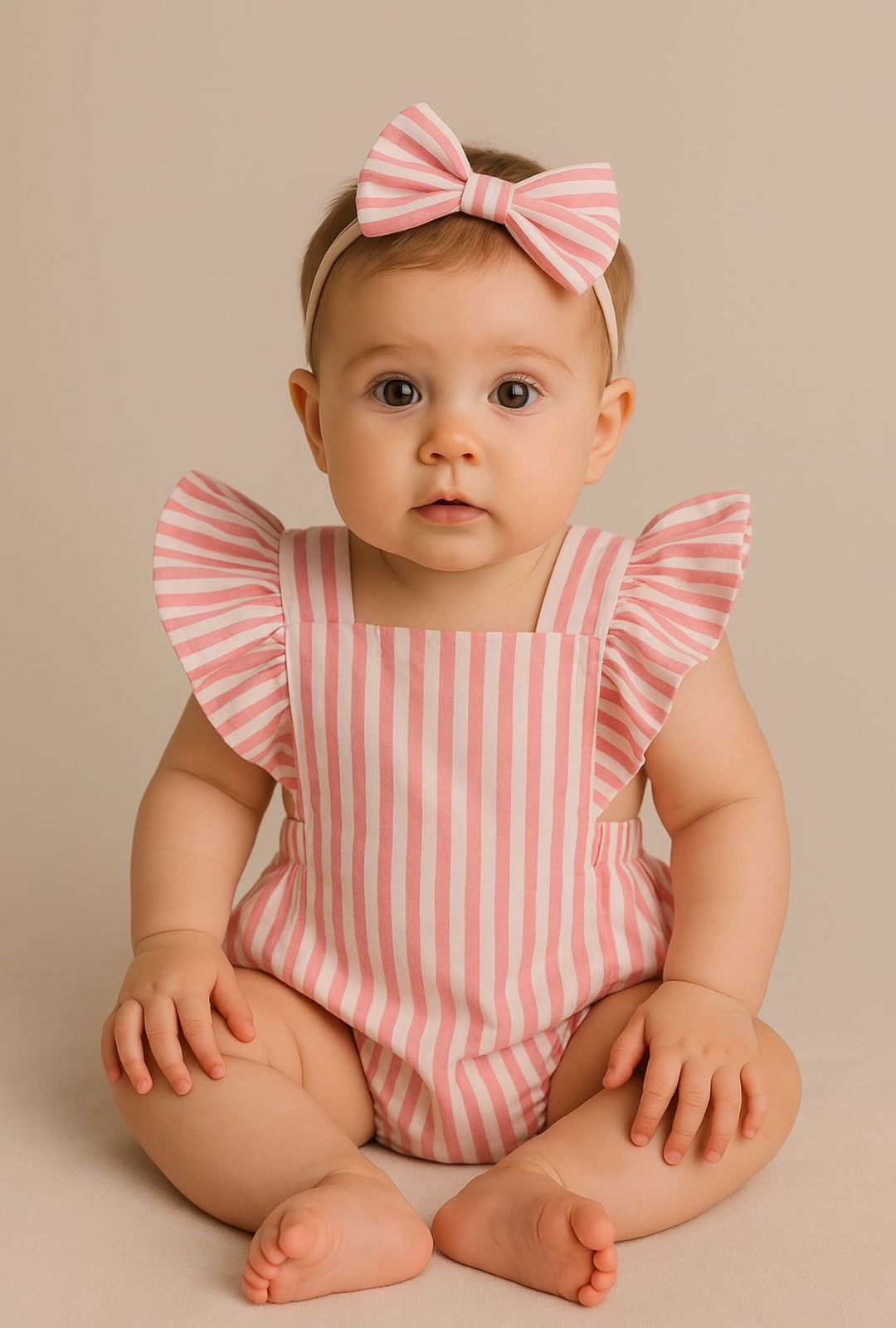 Romper Ariê – confeccionado em tecido listas 100% algodão, na cor rosa/branco. Modelo com alcinhas largas e babados delicados nas mangas, proporcionando um visual romântico e atemporal. Possui elástico na cintura e nas perninhas, garantindo conforto e liberdade nos movimentos da bebê.