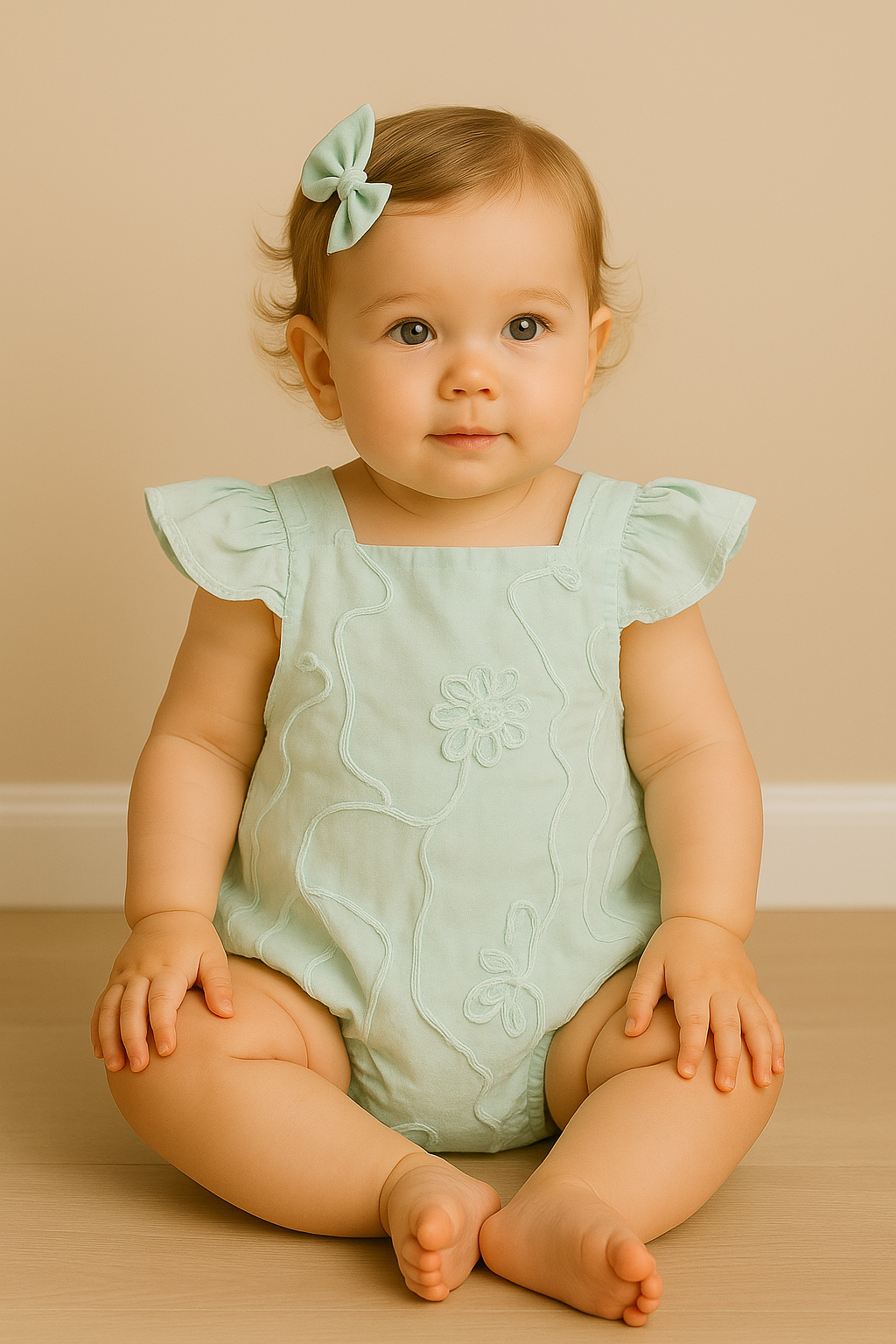 Romper Liz – confeccionado em tecido texturizado 100% algodão, na cor verde. Possui babados delicados nas laterais da alça, com regulagem, elástico na cintura e nas perninhas para mais conforto e charme.