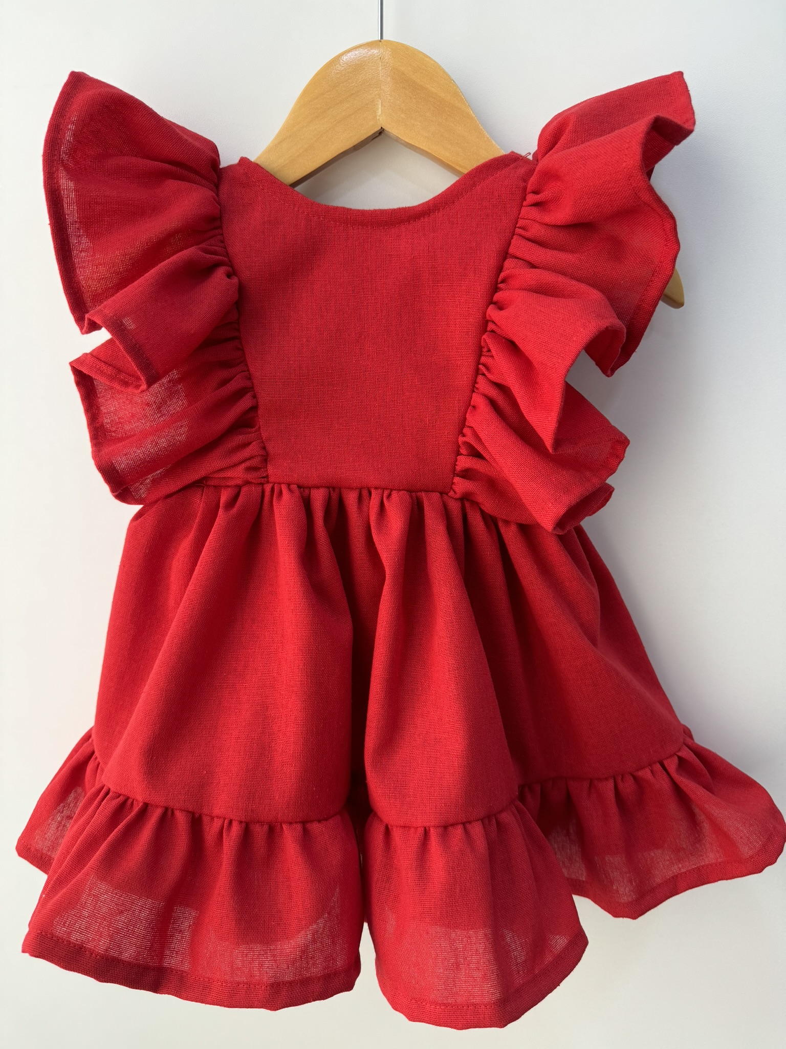 Vestido Ana, confeccionado em linho (55% viscose e 45% linho) vermelho com babados no peito e lastex nas costas.